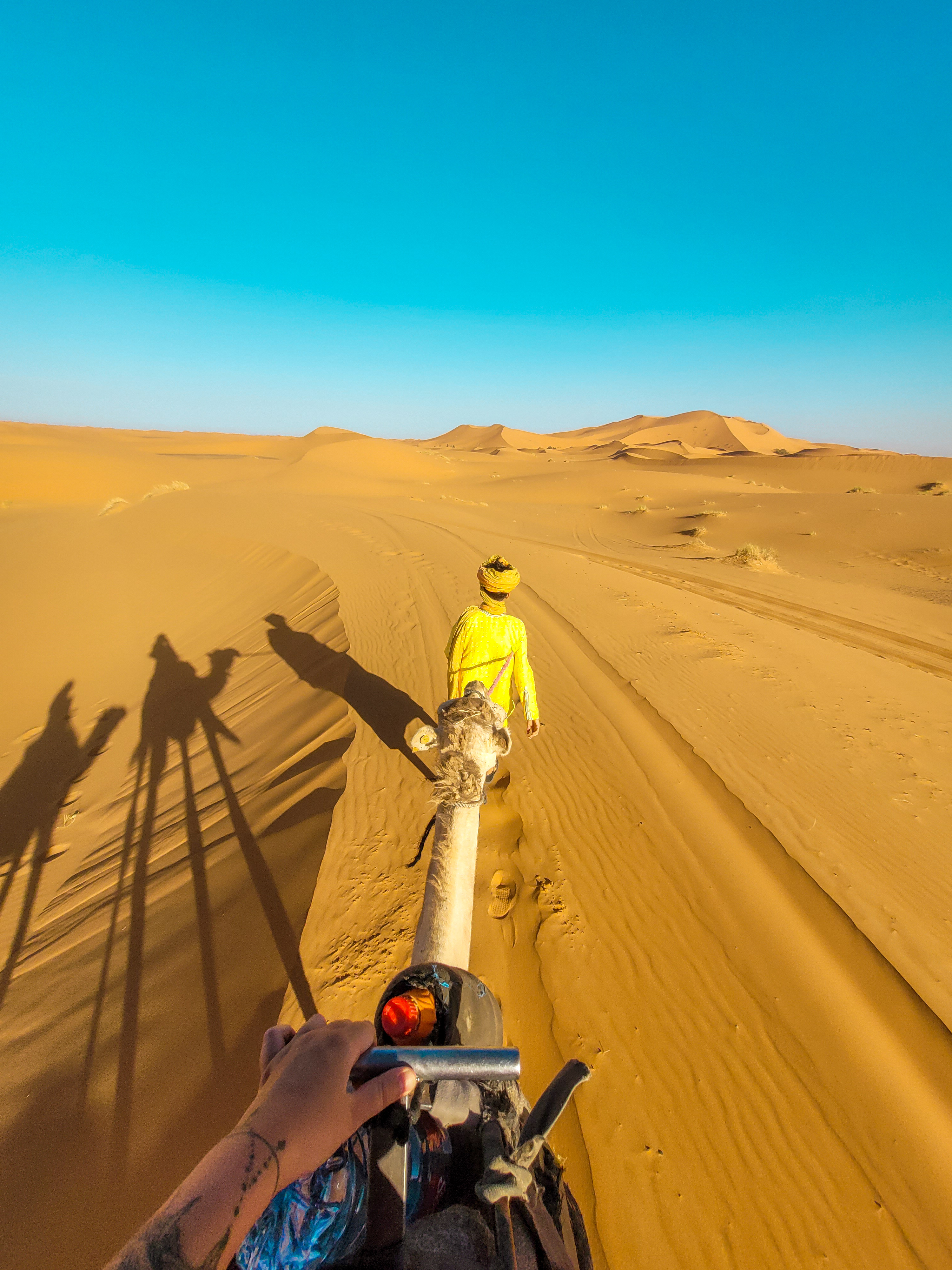 Dans le désert il fait très chaud, pas moins de 45 degrès la journée. Le matin du premier jour nous avons « tenté » de nous aventurer seuls dans les dunes de sable juste en face du riad, mais même le matin la chaleur était insoutenable alors après quelques clichés on a décidé de repartir à l’hôtel pour se rafraichir.