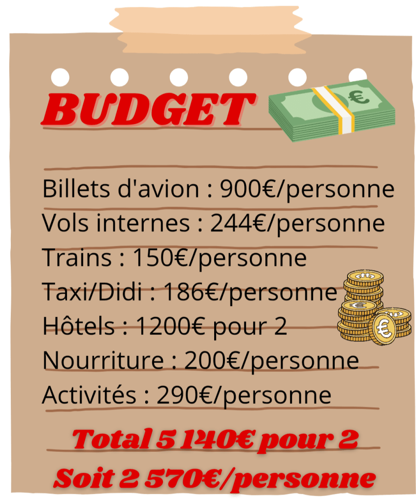 Pour rappel, ceci est notre budget, il peut varier en fonction de la compagnie aérienne avec qui vous voyagez, de la période, du type d’hôtels et des activités que vous souhaitez faire.